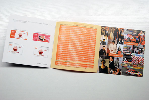 在最後一(yī)頁做(zuò)了(le)一(yī)個(gè)折頁的(de)形式,最左邊是(shì)産品附™帶品:代金(jīn)卷、蛋糕卡、定額卡、新年(nián)禮籃劵、禮盒,這(zhè)些(xiē)副産品增加的(de∞)事(shì)産品的(de)附加值,中間(jiān)是(shì)介紹的(de)有(yǒu)門(mén)店(diàn)的(de)具體(tǐ)地(dì)點,深淺£相(xiàng)間(jiān)的(de)橙色表格,與标志(zhì)的(de)背景色相(xiàng)統一(yī),最右邊是(shì)其贊助活動的(de)照(zhào)片,更是(shì)對(duì)•其産品實力和(hé)品牌的(de)一(yī)種提升。我們有(yǒu)“十”年(nián)的(de)從(c↕óng)業(yè)經驗,公司所有(yǒu)的(de)設計(jì)項目都(dōu)是(shì)由經驗豐富的(de)設計(jì)總監指導完成的(de)。我們堅持以度身(shēn)訂造之≥理(lǐ)念、打造行(xíng)業(yè)一(yī)流的(de)設計(jì)組,以創造獨到(dào)的(de)文(wén)化(huà)品牌新視(shì)覺執行(xíng)為(wèi)己任!。